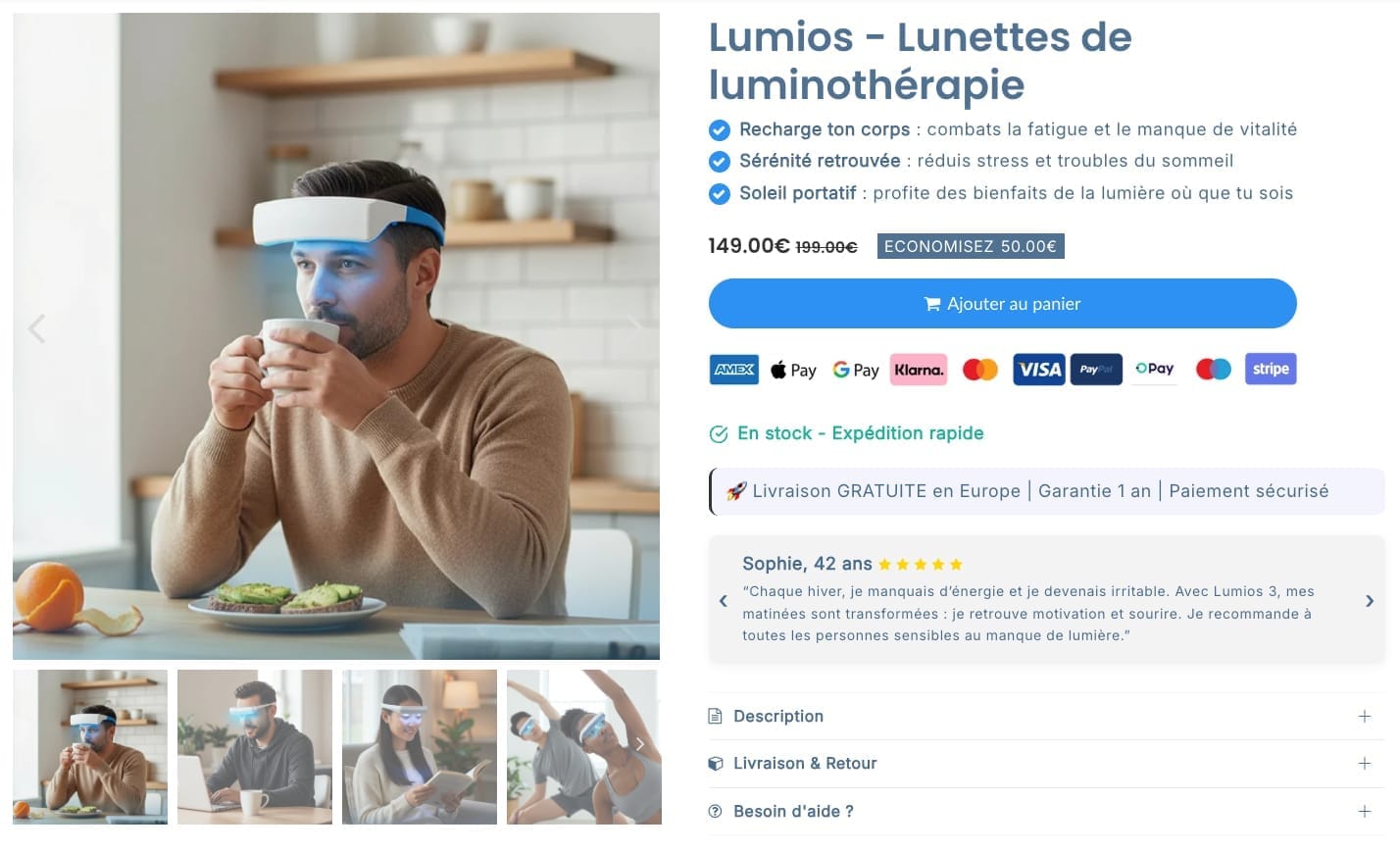 Zone de conversion pure avec tous les éléments clés : prix dynamique, boutons d’action, badges de confiance, le tout optimisé A/B testing.