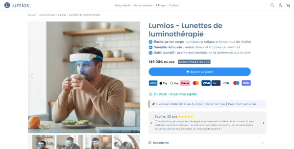Zone de conversion optimisée : prix dynamique, CTA, badges de confiance, A/B testing.