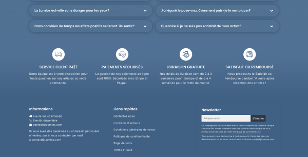 Newsletter intégrée, réseaux sociaux, badges paiement. SEO-friendly optimisé.
